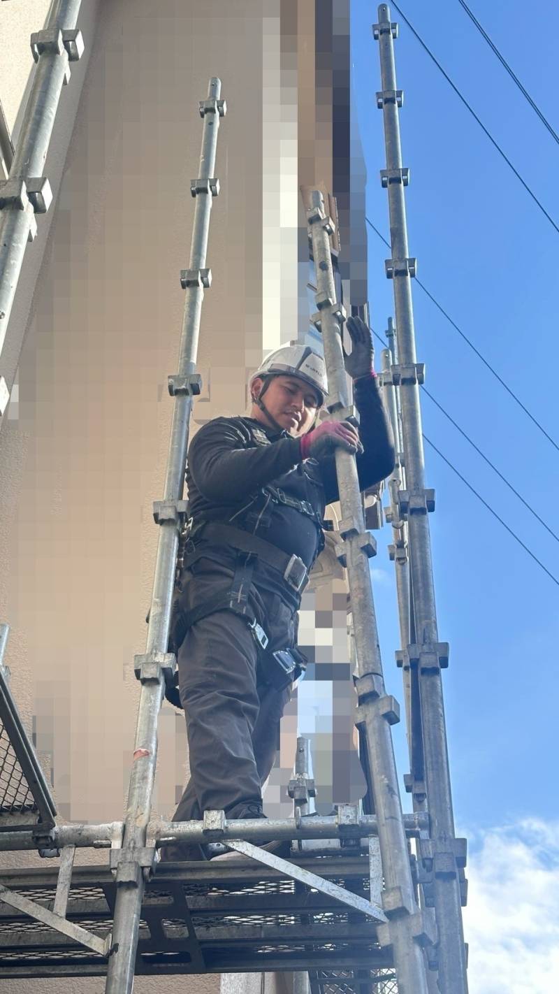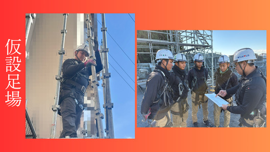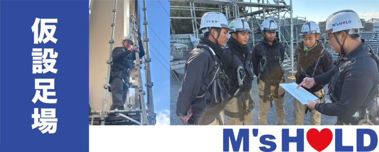 仮設事業部は普段は手が届かない箇所の作業用に足場を設置する工事で、用途に応じて各種足場を設置します。 足場の設置が完了すると、工事部材の落下防止、塗料等の飛散防止のためにメッシュシートで覆います。 現場マナー、監督様への報告・連絡・相談、施主様への挨拶などの「エムズブランド」を最も大切にしています。